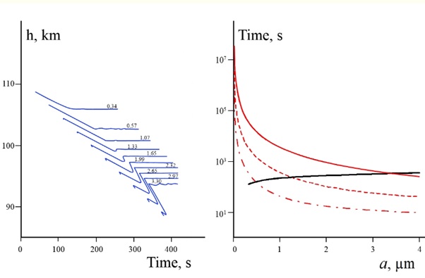 Данные графики наглядно иллюстрируют результаты расчетов. Слева — временная эволюция высотного распределения пылевых частиц в марсианских облаках, образовавшихся в результате седиментации пылевого облака зародышей, первоначально составляющего модельный прямоугольный профиль концентраций на высотах 110–120 км. Справа — зависимость характерного времени развития неустойчивости Рэлея — Тейлора и времени седиментации пылевых частиц от их размеров на высоте 90 км.