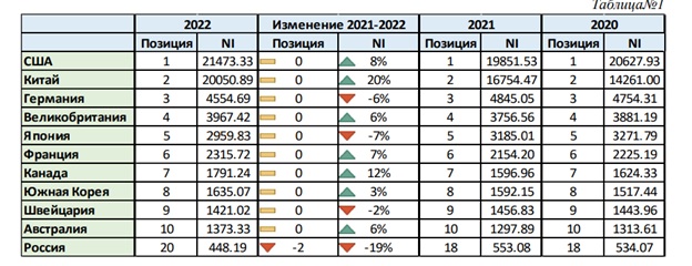 Позиции стран и показатели топ-10 в рейтинге, а также России за 2020–2022 год