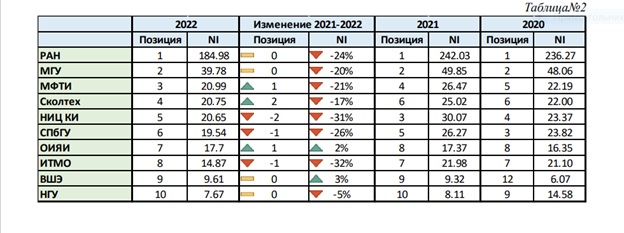 Наибольшее ухудшение публикационных показателей отмечается у ИТМО (–32%), НИЦ «Курчатовский институт» (–31%) и СПбГУ (–26%). Из топ-10 институтов по России в 2022 году только два продемонстрировали незначительное увеличение показателя — ОИЯИ и ВШЭ.