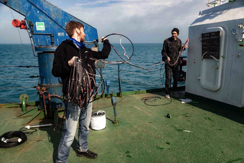 Отряд мезомасштабной гидрофизики установил метеостанцию и блок приема данных с автоматических буев. Развернуты термокосы — датчики температуры, соединенные кабелем в единую измерительную линию для проверки работоспособности.