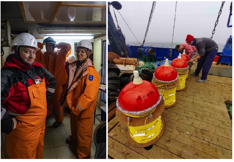 Отряд гидрологов проверяет термокосы и буи к ним, GPS-трекеры, CTD-зонд, ADCP и собирает несущую систему для его дрейфа. Еще надувают лодку для постановки буев во время дрейфа.