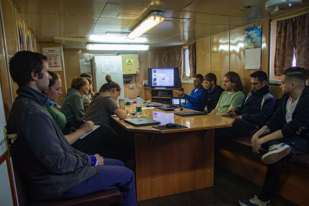 Между работами слушали лекцию по мезомасштабным процессам в океане начальника экспедиции Алексея Зимина.