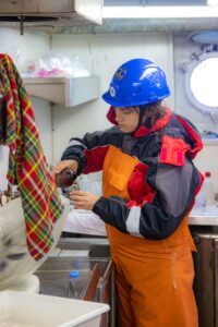 Биологи провели вскрытие поднятых со дна организмов для дальнейшего выделения ДНК из микробиома кишечника бентосных животных. Отработано семь станций, на которых проведен отбор проб для определения бактериального сообщества. Район представляет большой интерес для исследователей, так как в этом месте наблюдается смешивание двух водных масс с разными гидрологическими параметрами.