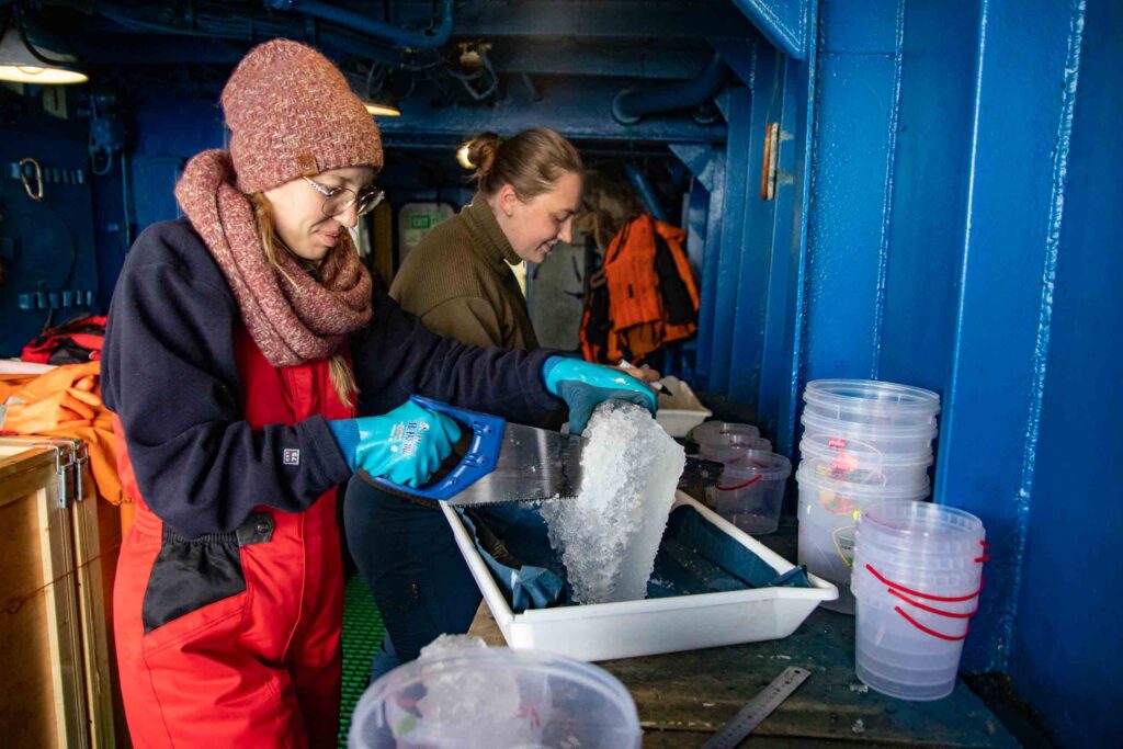 А для отряда гидробиологии это означало начало активной работы с криофауной. Первую половину дня на судне были слышны звуки пилы и молотка, раскалывающего мерзлые пробы пополам.