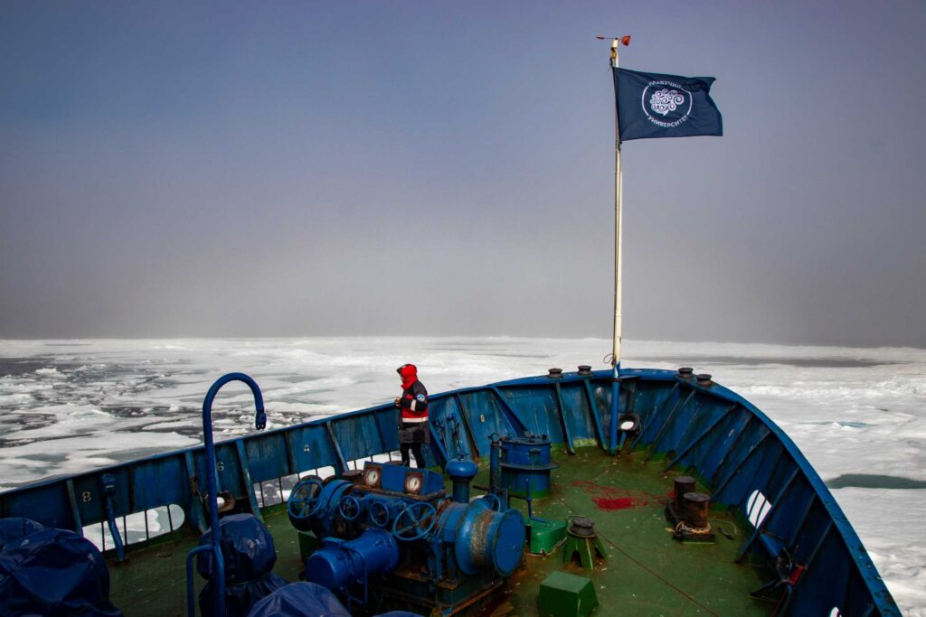 Утром команду НИС «Дальние Зеленцы» неожиданно поразил сильный скрежет и грохот. Лед! Огромные поля самого разного льда. Не передать словами, какую радость испытал каждый из участников экспедиции!