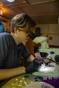 Отряд гидробиологов в этот день собрал еще несколько черпаков для изучения бентосных организмов и продолжил разбор отобранных ранее проб. Производился микробный анализ толщи воды, выделялась ДНК из организмов, фильтровались пробы на фитопланктон и хлорофилл А, а также проводился разбор ледовых проб, отобранных за вчерашний день.