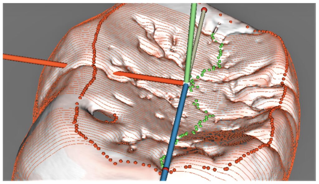 Зуб орангутанга с разрезами жевательной поверхности и средней линией, отмеченной зелеными точками. Источник: The Journal of Imaging