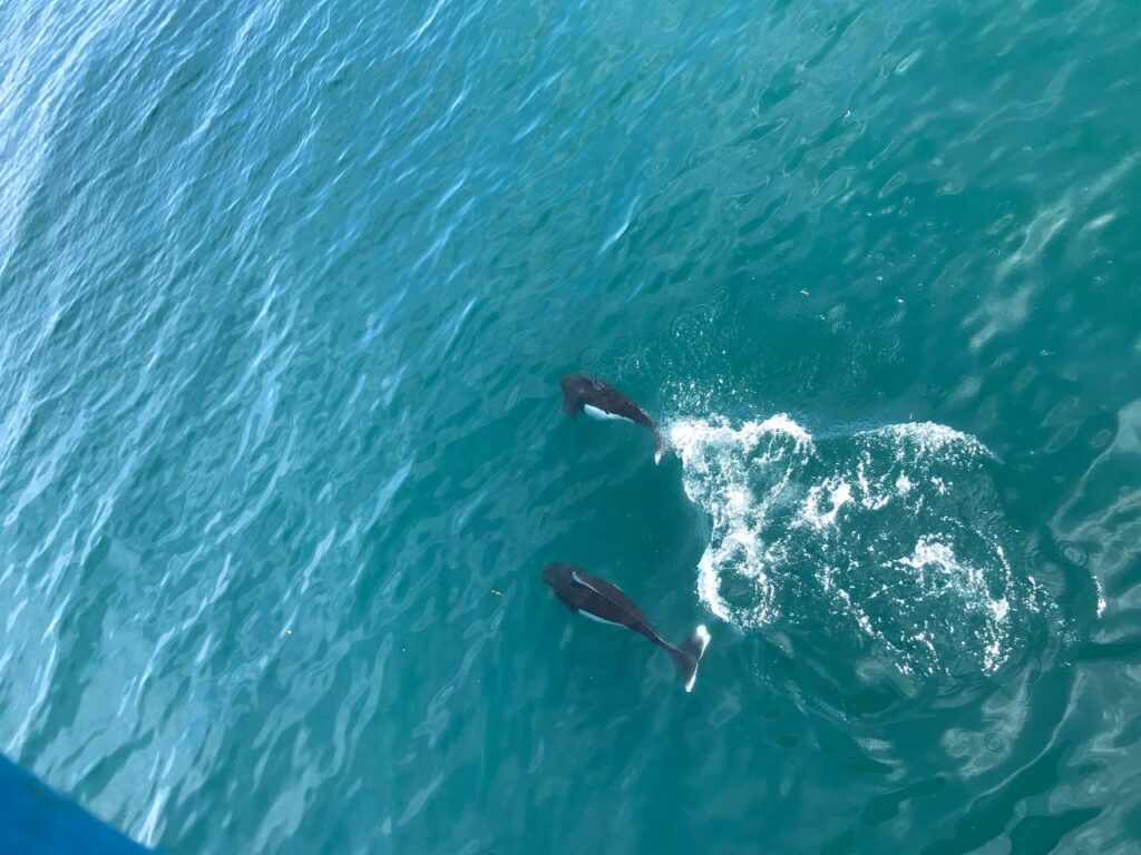 Сегодня видели зубатых китов, подозреваем, что это были белокрылые свиньи. Они игрались вдвоем, выпрыгивая из воды то с одной стороны судна, то с другой, потом сделали пару прощальных пируэтов и скрылись на горизонте.