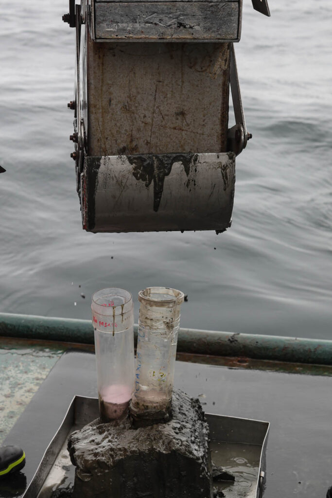 Далее берутся вода и грунт из бокс-корера. Проба смыва воды с грунта берется для получения образцов цианобактерий. Следующий этап работ — взятие проб поверхностных слоев грунта, собранных бокс-корером. Берутся пробы на мейобентос, биотестирование и микрофитобентос.