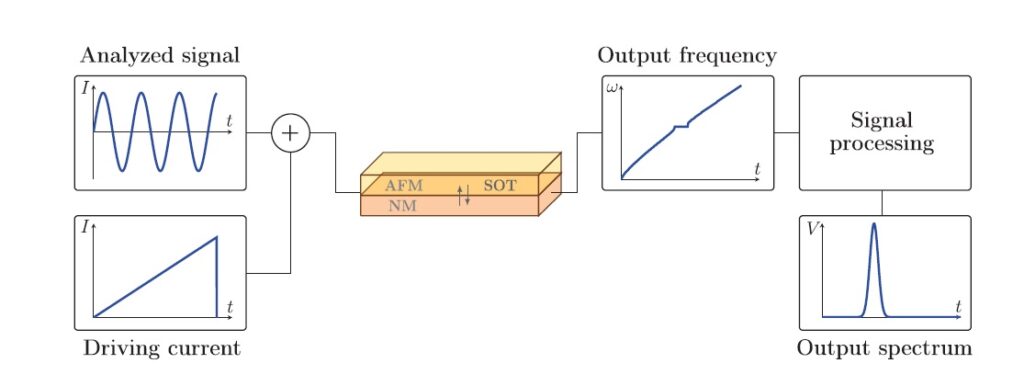 Рисунок 1. Структурная схема анализатора спектра субтерагерцовых колебаний на основе гетероструктуры антиферромагнетик / немагнитный металл. Первым входным сигналом является управляющий ток, который приводит к передаче спин-орбитального момента на антиферромагнетик, а затем на немагнитный металл, в результате чего возникает переменный электрический ток. Второй вход — анализируемый сигнал, с которым синхронизируется антиферромагнетик, когда частота его колебаний совпадает с частотой внешнего сигнала. После цифровой обработки сигнала с выхода анализатора спектра по напряжению можно определить частоту внешнего сигнала по временному положению всплеска постоянного тока. Источник: IEEE Transactions on Nanotechnology.