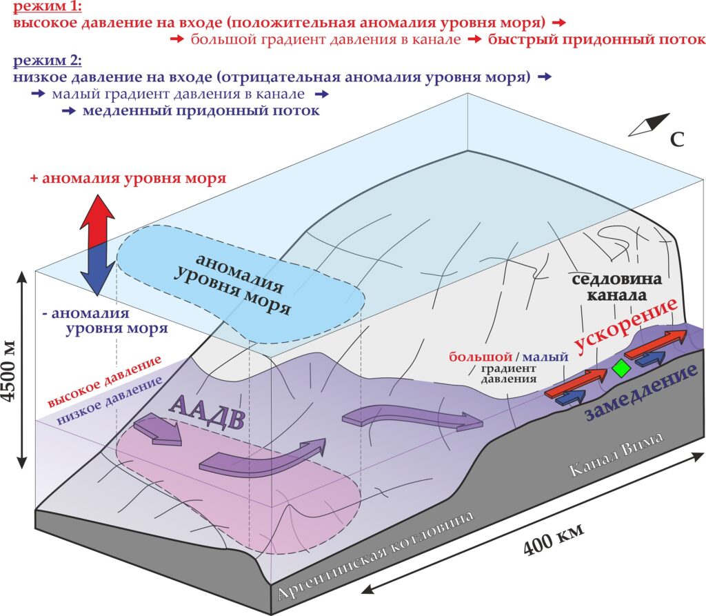 «Канал Вима является уникальной природной лабораторией, позволяющей нам исследовать крупномасштабные течения в абиссали Мирового океана. В данном случае на примере канала удалось исследовать временную изменчивость течений, механизмы которой остаются малоизученными. Ученым известно, что периодически поток в канале Вима практически полностью останавливается, а периодически, наоборот, ускоряется почти в два раза. Движущей силой для потока воды в канале является накопленная потенциальная энергия: Аргентинская и Бразильская котловина, по сути, являются сообщающимися сосудами, заполненными водой разной плотности. Поскольку вода в абиссали Аргентинской котловины более холодная и, соответственно, более тяжелая, формируется поток воды через канал в Бразильскую котловину, где воды в абиссали более теплые и легкие. Таким образом, причины возникновения течения известны, но вот почему наблюдается такая сильная изменчивость? Ответа на этот вопрос нет, и механизмы подобных изменений крайне сложно отследить из-за почти полного отсутствия данных на таких глубинах. Цель нашей работы — приблизиться к пониманию изменчивости абиссальных течений и показать, что процессы на поверхности океана имеют более существенную связь с придонной циркуляцией, чем считалось ранее», — подчеркнул Дмитрий Фрей.