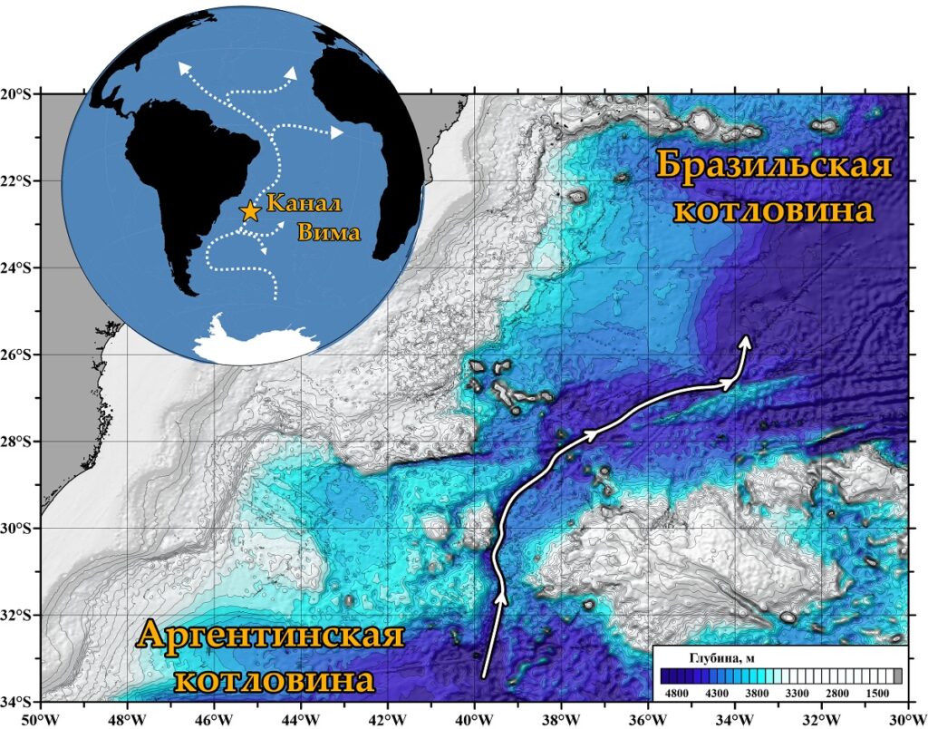 Особое внимание ученых привлекает канал Вима — узкий, длинный канал протяженностью 700 километров на дне, который соединяет две крупномасштабные котловины Юго-Западной Атлантики: Аргентинскую и Бразильскую. В канале Вима наблюдается одно из самых сильных абиссальных течений в Мировом океане — скорость потока может превышать полметра в секунду, что всего вдвое медленнее Гольфстрима, а расход воды через канал как минимум в 10 раз превышает сток Амазонки — самой полноводной реки в мире. Этим потоком и был промыт канал Вима — процесс происходит десятки миллионов лет, и сейчас высота стенок канала достигает 500 метров. Подобные глубоководные каналы являются ключевыми точками, контролирующими придонную циркуляцию: они определяют пути распространения донных вод, влияют на водообмен между океаническими котловинами и задают потенциальную температуру в придонном слое Мирового океана.