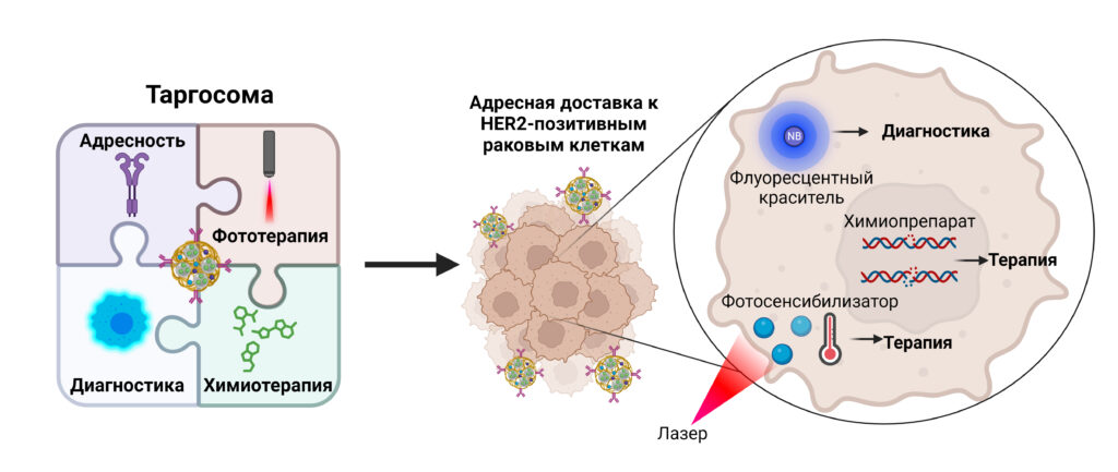 «Мы провели большую исследовательскую и экспериментальную работу. В итоге была продемонстрирована успешная визуализация опухоли и отдаленных метастазов на примере таргосом, загруженных одновременно флуоресцентным красителем для диагностики, фотосенсибилизатором и химиопрепаратом. Они были нацелены на клинически значимый онкомаркер HER2. Эффективность уничтожения опухоли составила более 90%.