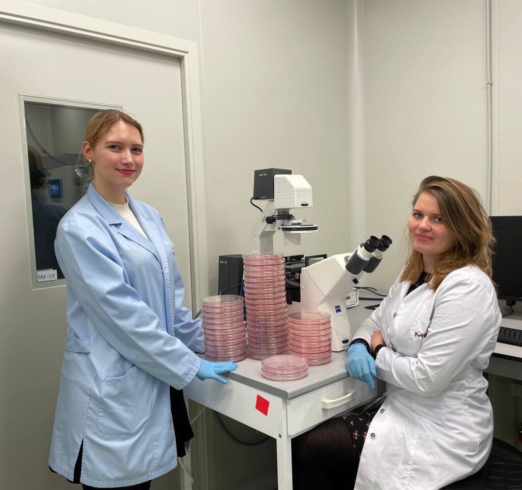 Фото. Сотрудники лаборатории биохимических исследований канцерогенеза МФТИ Елена Комедчикова (слева) и Ольга Колесникова (справа) наращивают культуры раковых клеток на чашках Петри