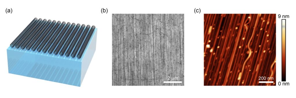 Рисунок. 1 (а) — схематическое изображение монослоя выровненных углеродных нанотрубок; (b) — изображение морфологии синтезированных нанотрубок, полученное с помощью сканирующей электронной микроскопии; (с) — топография полученных образцов с помощью атомно-силовой микроскопии. Источник: Rapid Research Letters.