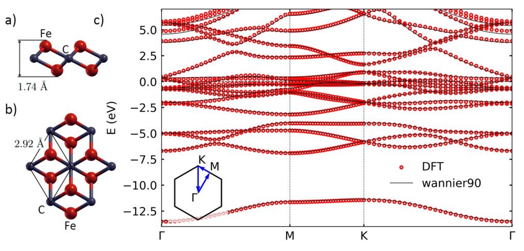 Ученые рассмотрели кристаллическую структуру Fe2C (рисунок 1 a, b). После расчета зонной структуры (рис. 1 с) с помощью программного пакета Wan2mb, разработанного в лаборатории компьютерного дизайна материалов, был произведен учет магнитных и электронных корреляций в указанном веществе в рамках современного метода — динамической теории среднего поля. Расчеты показали, что Fe2C обладает локальным магнитным моментом 3,3 магнетона Бора со временем жизни ≃ 350 фемтосекунд (1фс=10-15 секунды). Авторы получили также плотность состояний и собственную энергию электронов с учетом их взаимодействия. Вычисленные авторами значения обменных взаимодействий позволили предсказать температуру магнитного перехода указанного вещества. В силу магнитной анизотропии типа «легкая плоскость» в рассмотренном веществе ожидается так называемый переход Березинского — Костерлица — Таулеса (БКТ), связанный со спариванием магнитных вихрей и формированием аналога дальнего магнитного порядка ниже соответствующей температуры перехода. Оценки указанной температуры дают значение температуры перехода TБКТ порядка комнатной, что более чем на порядок превосходит температуру перехода ранее известных аналогичных материалов. Результатом работы стали также теоретические оценки других физических характеристик вещества.