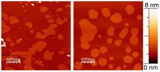 Рисунок. Структура липидной мембраны, моделирующей мембрану нейрональных клеток, полученная с помощью атомной силовой микроскопии: (a) — с фрагментами белка-предшественника бета-амилоида, (b) — без фрагмента белка. Источник: Membranes