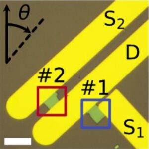 Рисунок. Слева — иллюстрация принципа работы детектора с геометрически неэквивалентными контактами. Световая волна падает сверху на двумерный материал (зеленый) с металлическими контактами (желтый). Если вектор напряженности в волне E0 поперечен к металлической кромке, то волна усиливается. Если он параллелен к металлической кромке — волна ослабляется. Это приводит к разному количеству активных электронов на двух встречных контактах детектора. На рисунке справа их больше, слева — меньше. Со стороны экспериментатора это означает измеримый фототок. Справа — микрофотография реально изготовленного и изученного прибора. #1 — оригинальный детектор со взаимно поперечными контактами. #2 — обыкновенный резистор с рабочим телом из двумерного материала и двумя параллельными контактами (для сравнения). Длина белой масштабной линейки — 10 микрон. Источник: Nano Letters