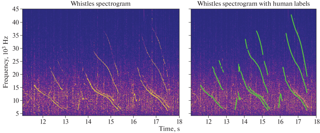 Спектрограмма сигнала свиста дельфинов, образующего характерный контур с повышенной спектральной плотностью мощности (слева) и экспертная разметка этих контуров на фоне этой же спектрограммы (зеленые линии справа). Источник: Moscow University Physics Bulletin