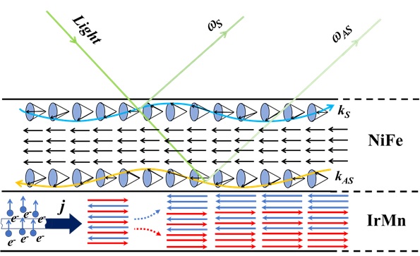В своей новой работе российские ученые использовали это явление для того, чтобы исследовать спиновый ток в антиферромагнитной пленке. С антиферромагнетиком трудно работать потому, что намагниченность этого материала мала. Чтобы решить проблему, на антиферромагнетик нанесли ферромагнетик и действовали по схеме, описанной выше. Если в антиферромагнетике что-либо происходит, спектр Бриллюэновского рассеяния света в соседнем ферромагнитном слое немедленно откликается на даже небольшие изменения в антиферромагнетике. Проводя данные эксперименты в образцах нанометровой толщины, физики обнаружили новый эффект: изменение цвета отраженного луча во время протекания тока по антиферромагнетику.