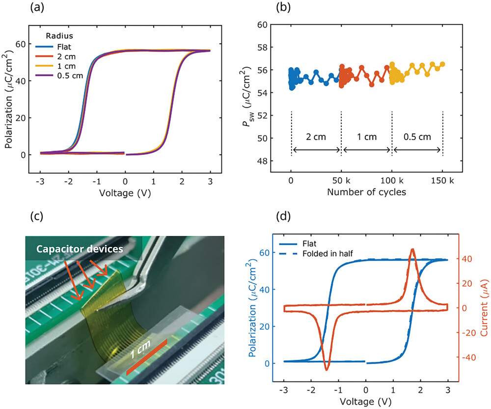 Рисунок 1. Результаты измерения поляризации — «запоминающего» параметра пленки — при различных сгибах. Графики а, b, d показывают, что при изменении параметров эксперимента поляризация изменяется незначительно. Источник: Advanced Electronic Materials