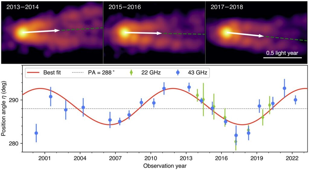 Чтобы точно проследить долговременную морфологическую эволюцию джета вблизи сверхмассивной черной дыры в М87, ученые проанализировали 170 интерферометрических изображений, полученных в 2000–2022 году на частотах 22–24 и 43 ГГц. Именно эти снимки показали, что, помимо известной постоянной морфологии струи с уярчением к краям, за эти годы можно увидеть изменение позиционного угла направления струи. Большой ряд наблюдений ясно показывает систематические квазисинусоидальные колебания струи джета в масштабе года с размахом амплитуды примерно 10° (Рисунок 1).