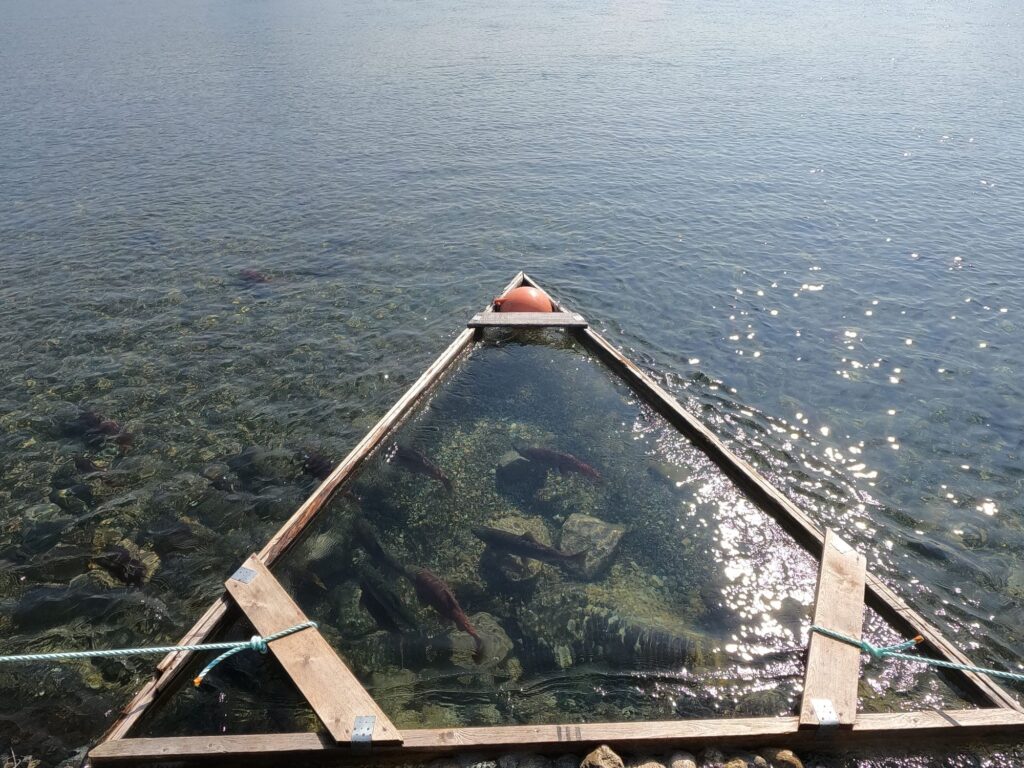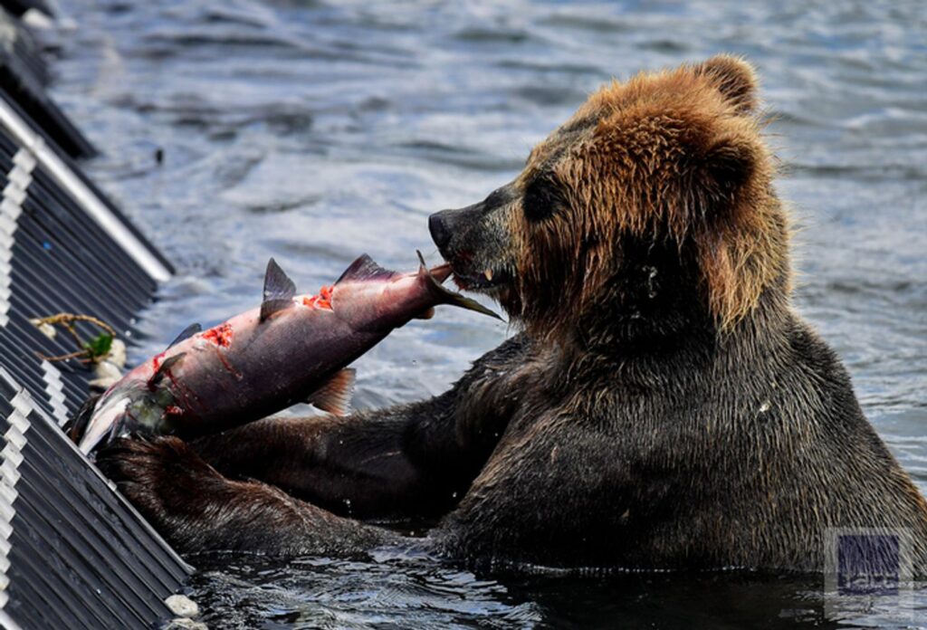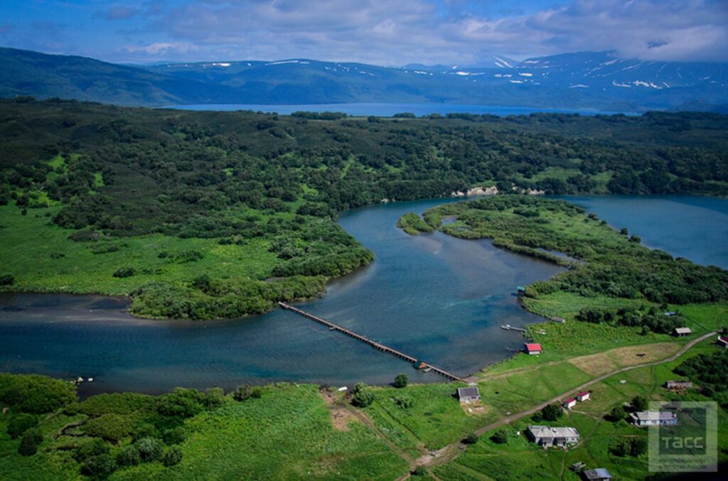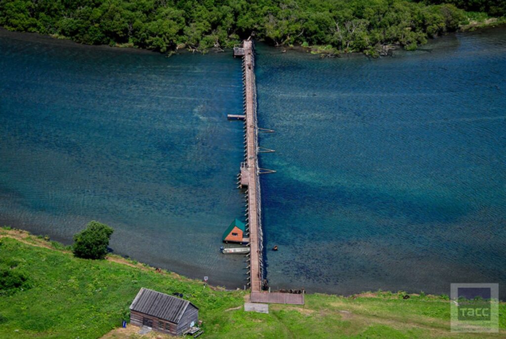 У реки Озерной расположена территория КамчатНИРО. Основная задача сотрудников этой организации — считать рыбу, которая проходит по реке из Охотского моря в Курильское озеро. Для этих целей стоит специальная загородка, перегораживающая реку. Темные пятна около нее — это скопившаяся рыба, ждущая своей очереди на проход. Когда рыба идет вверх против течения реки, вода в ней буквально кипит. Численность лосося варьируется от 2 миллионов до 6 миллионов голов в сезон.