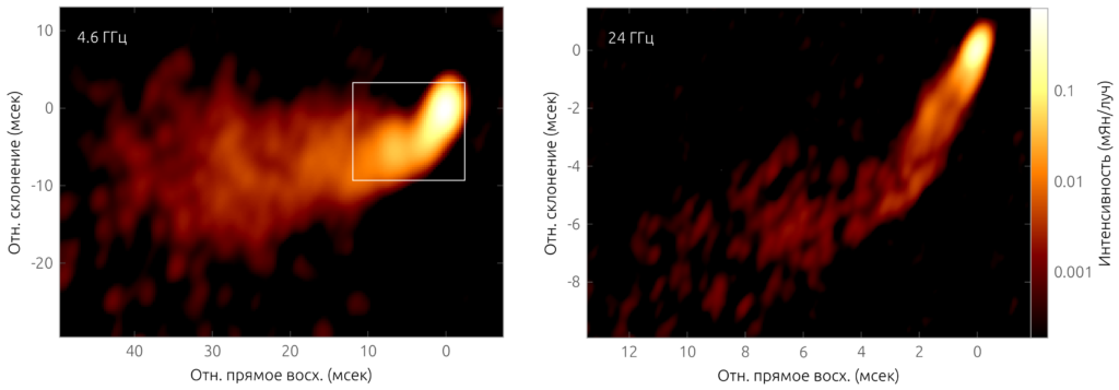 Рисунок 1. Изображения блазара Mrk 501 с высоким разрешением на частоте 4,6 ГГц (слева). Белый прямоугольник показывает масштаб более высокочастотного изображения блазара на 24 ГГц, приведенного справа. Видимое положение самой яркой детали джета — РСДБ-ядра — отличается на разных частотах таким образом, что ядро на 24 ГГц будет находиться ближе к центральной черной дыре, по сравнению с ядром на 4,6 ГГц, которое удалено дальше по джету. Этот эффект называется «сдвигом ядра» и обусловлен синхротронным самопоглощением излучения в оптически непрозрачной плазме. В нашем гранте мы показали, что по величине сдвига РСДБ-ядер с частотой можно не только оценивать величину магнитного поля в этих областях, но и изучать профиль коллимации