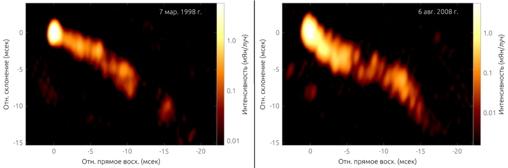 Рисунок 2. Изображения блазара 3С273 на частоте 15 ГГц с высоким разрешением в эпоху наблюдения VLBA 7 марта 1998 г. (слева) и 6 августа 2008 г. (справа). Источник: MOJAVE/2cm Survey Data Archive. Видимое направление джета в области 5 угловых миллисекунд от РСДБ-ядра изменилось более чем на 200. Это может быть вызвано прецессией джета или его неоднородностью в виде плазменных неустойчивостей. В рамках гранта РНФ мы предложили и провели моделирования модели прецессирующих джетов со спиральным магнитным полем. Мы показали, что такая модель лучшим образом воспроизводит сильно-переменное во времени поведение линейной поляризации джетов. См. детали в работе Тодоров и др., 2023