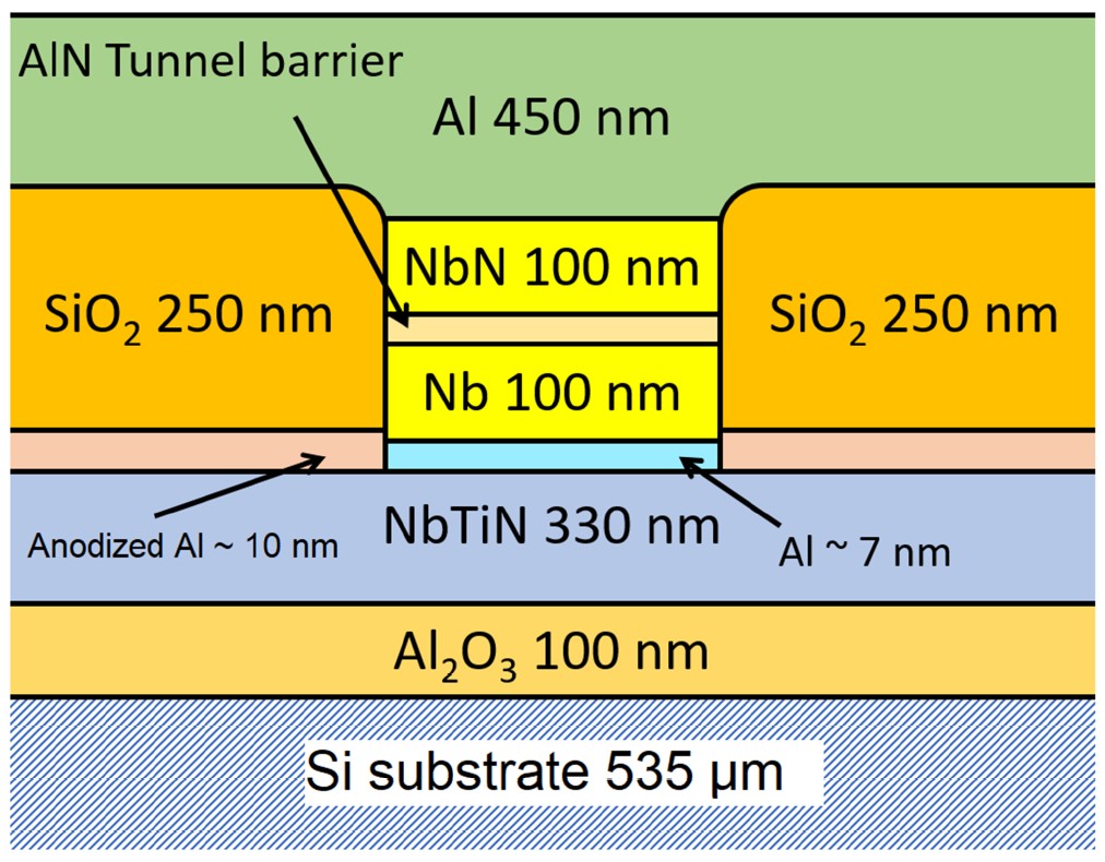 Рисунок 1. Схематичное изображение SIS-перехода (ниобий Nb — изолятор — нитрид ниобия NbN), встроенного в линию «алюминий Al — ниобий-нитрид титана NbTiN». Источник: Transactions on Applied Superconductivity