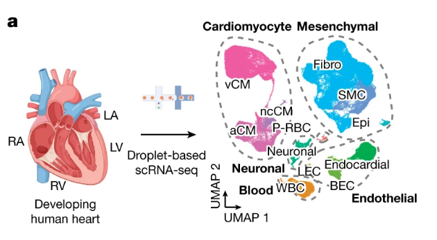 scRNA-seq идентифицирует разнообразный диапазон различных сердечных клеток, которые создают развивающееся человеческое сердце.