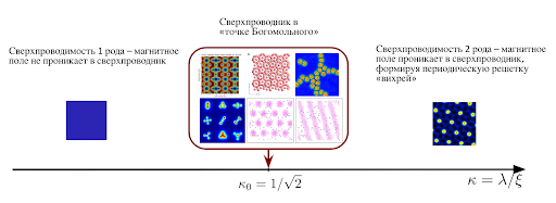 Зависимость магнитных свойств сверхпроводника от параметра Гинзбурга — Ландау. Рисунок предоставлен Алексеем Ваговым