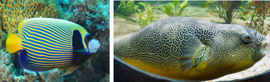 Примеры паттернов на чешуе рыб: 1) императорская рыба-ангел 2) гигантская рыба-фугу. Источник: Википедия