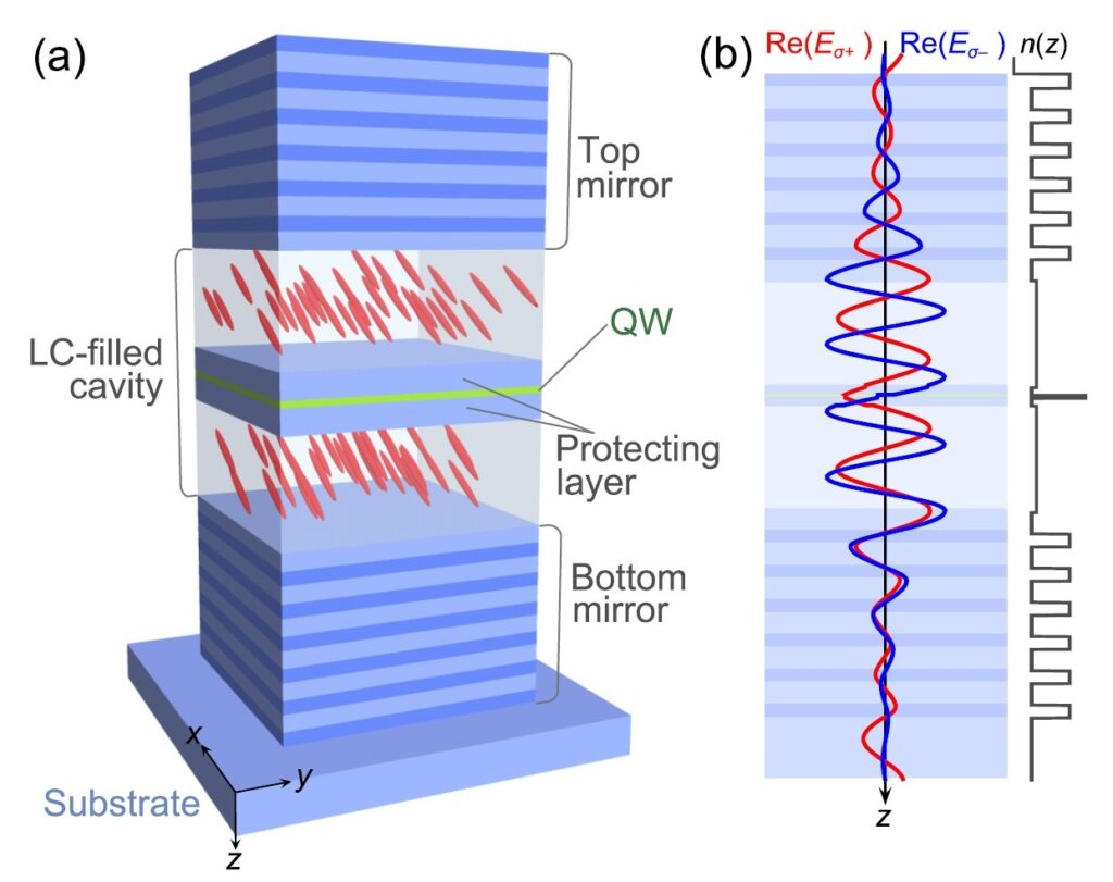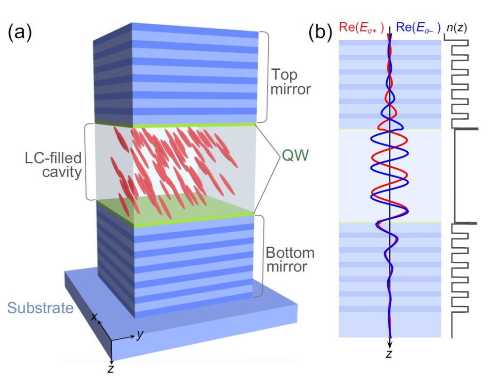 Рисунок 2. Схема конструкции с двумя отражателями, ЖК-наполнителем и одним слоем квантовых ям, который расположен в центре полости. Источник: Physical Review Research