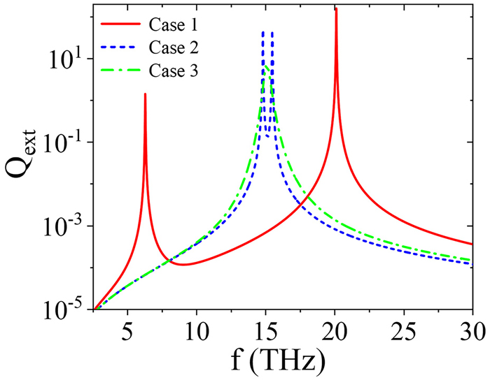 Рисунок 3. Зависимость сечения экстинкции от частоты импульса в трех типичных случаях. Источник: Journal of Applied Physics