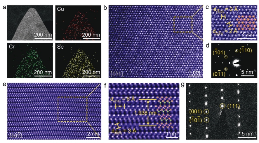 Атомная структура полученных нанокристаллов. Изображения получены с помощью различных видов просвечивающей электронной микроскопии (ПЭМ). a) ПЭМ-изображение нанослоя CuCrSe2 с картированием элементов (Cu, Cr, Se) методом энергодисперсионной спектроскопии (EDS). b, c) HAADF-STEM (просвечивающая электронная микроскопия с высокоугловым кольцевым темным полем) изображения кристалла CuCrSe2 с высоким разрешением в режиме просвета (b) и выделенной области (c). Врезки — компьютерная модель структуры кристалла. d, g) Дифракционные картины кристалла CuCrSe2 в режимах просвета (d) и поперечного сечения (g). e, f) HAADF-STEM изображения кристалла CuCrSe2 в поперечном сечении (e) и выделенной области (f). Врезка — компьютерная модель структуры кристалла. На рисунках (c) и (f) медь, хром и селен обозначены зеленым, розовым и оранжевым соответственно. Источник: Advanced Materials