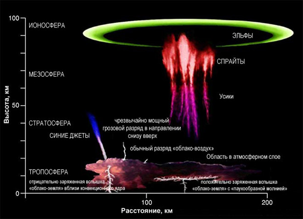 При этом в ней происходят яркие световые события: спрайты, голубые джеты, эльфы и гигантские джеты, охватывающие световые потоки в широком диапазоне частот, от СНЧ до УВЧ. Спрайты наблюдаются на высоте примерно 50–90 км над уровнем моря и часто связаны с интенсивными положительными молниями от облака к земле. Голубые струи, с другой стороны, выбрасываются вверх из вершин грозовых облаков на высоту около 15–40 км. Эльфы, возникающие в нижней части ионосферы на высоте 90 км, возникают в результате взаимодействия электромагнитных импульсов, вызванных молнией, и ионосферы. Кроме того, гигантские струи, впервые обнаруженные в начале 2000-х годов, простираются от грозовых облаков до ионосферы, потенциально вызывая короткое замыкание облачного заряда в верхние слои атмосферы. Эти явления подчеркивают сложные взаимодействия между атмосферным электричеством, конвективными процессами и ионосферной средой.