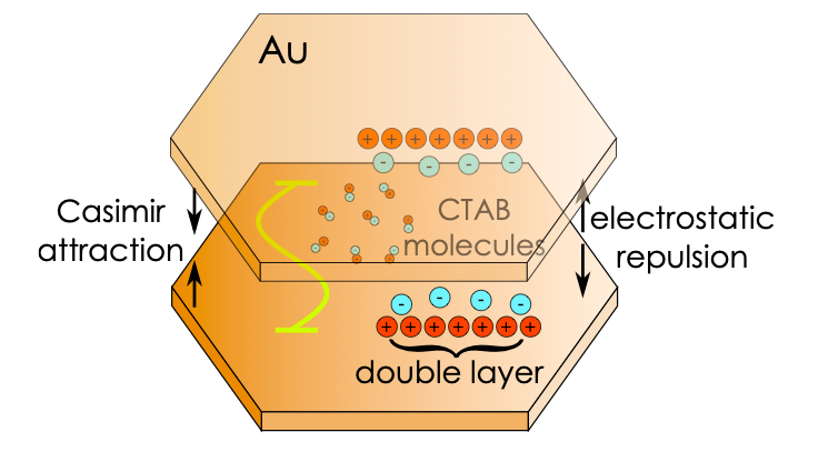 Естественно, размышляя о том, что удерживает пленки вместе, ученые сразу же подумали про эффект Казимира. Однако те, подобравшись друг к другу, не слипались в единую пластину. Между ними так и оставалось относительно неизменное расстояние в 100-200 нанометров в зависимости от условий эксперимента. Вскоре им стало ясно, продолжает Баранов, что на пленки действуют еще и силы электростатического отталкивания: положительно заряженные ионы соли, растворенные в воде, осаждались на металлических поверхностях пленок. Соответственно, пленки, сближаясь из-за казимировского притяжения, в какой-то момент отказывались двигаться дальше по направлению к телу с тем же самым зарядом.