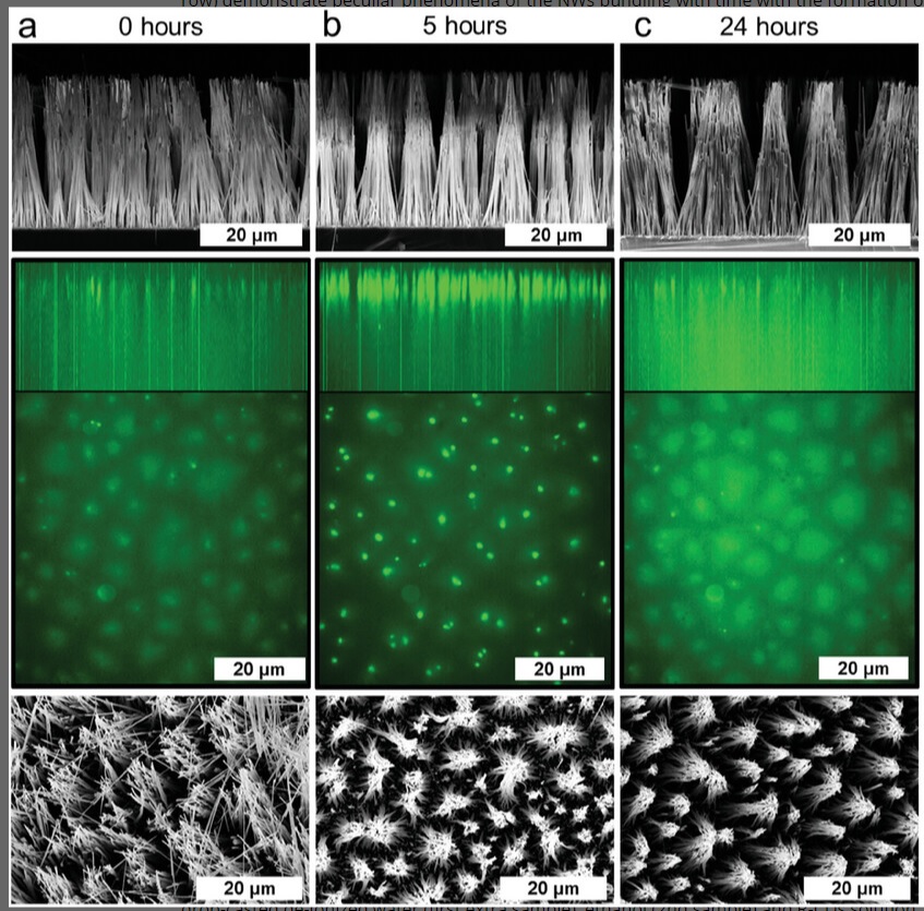 Изображение групп нитевидных кристаллов сбоку и сверху и их люминесценция для трех образцов. Указанный масштаб — 20 микрометров. Источник: Advanced Optical Materials