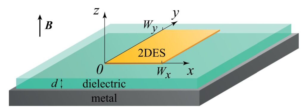 В модели двумерной системы проводящий прямоугольник содержит идеальный газ из электронов и находится на диэлектрической подложке, которая лежит на бесконечной плоскости, сделанной из идеального проводника (металла). Перпендикулярно этой системе приложено внешнее магнитное поле.