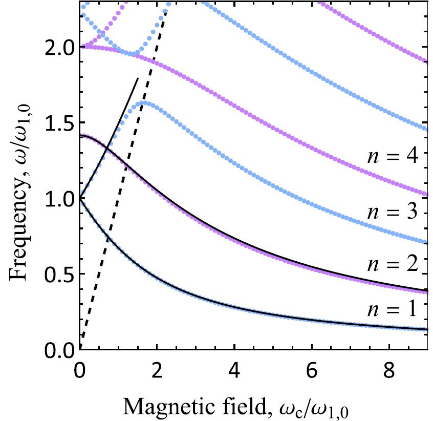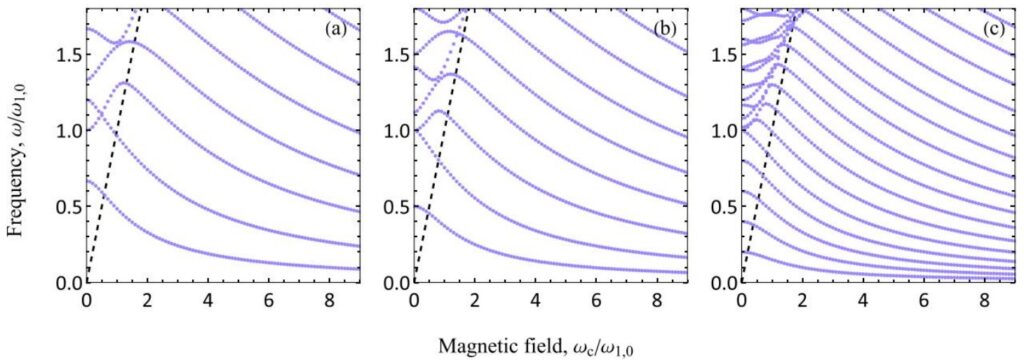 Исследователи провели расчеты и получили также приближенную аналитическую зависимость частоты плазменных колебаний от циклотронной частоты внешнего магнитного поля — величины, которая прямо пропорциональна магнитному полю и равна частоте обращения электрона, движущегося в этом поле по окружности.