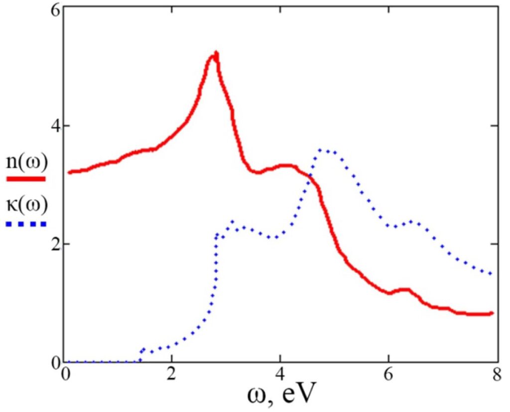 Рисунок 1. Зависимость вещественной и мнимой части показателя преломления арсенида галлия (GaAs) от частоты лазерного импульса, выраженной в электрон-вольтах. Источник: Journal of Optics