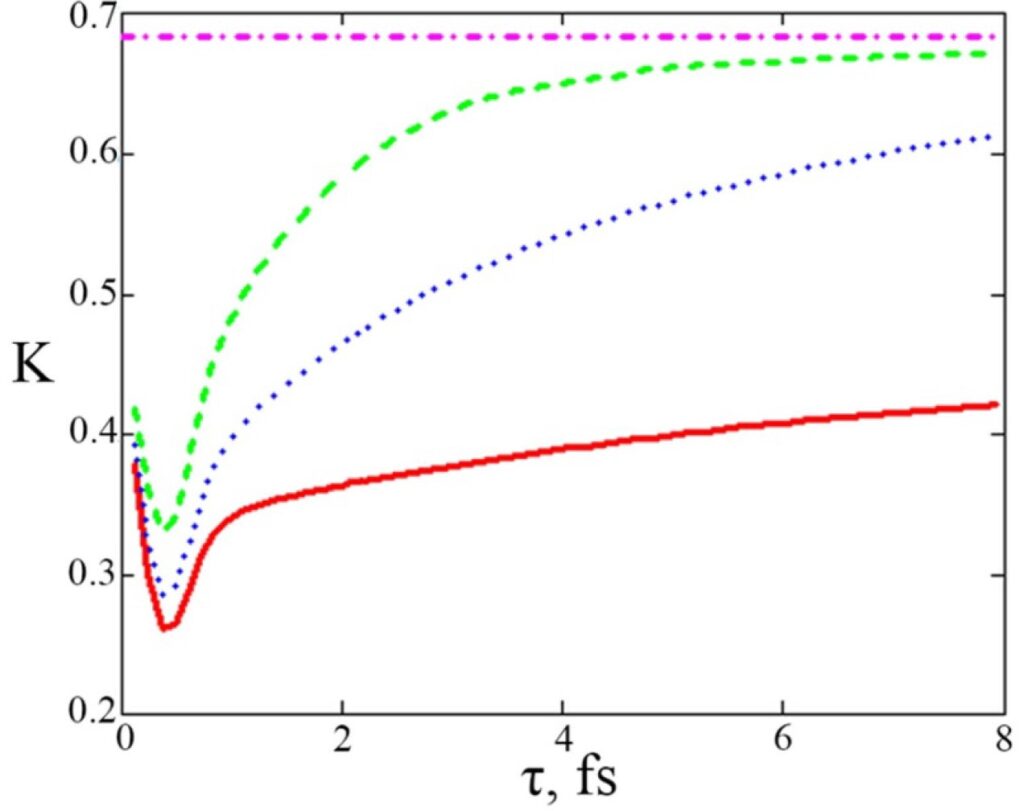 Рисунок 3. Зависимость общего коэффициента поглощения от длины лазерного импульса при частоте, соответствующей энергии 1,5 электрон-вольт, для пластин арсенида галлия разной толщины. Сплошная линия — L = 10 мкм, пунктирная линия — L = 100 мкм, штриховая линия — L = 1 мм, штрихпунктирная линия — для импульса бесконечной длительности. Источник: Journal of Optics