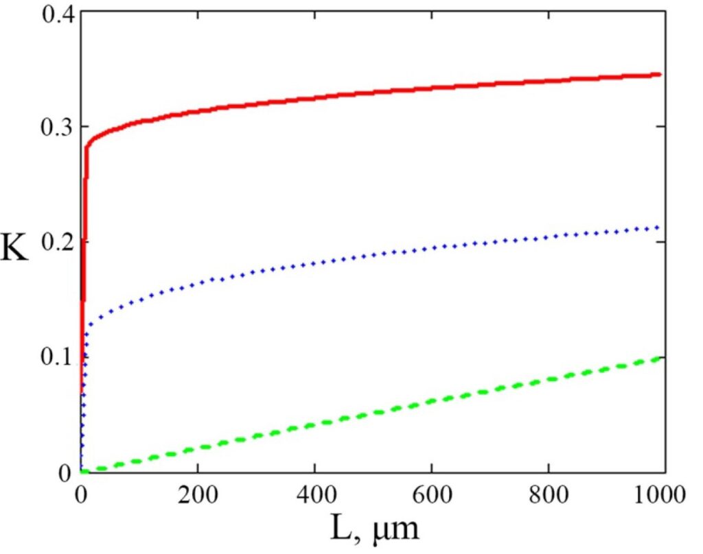 Рисунок 5. Зависимость общего коэффициента поглощения от толщины пластины арсенида галлия при частоте, соответствующей энергии 1,424 электрон-вольт, которая равна ширине запрещенной зоны материала. Сплошная линия соответствует длительности лазерного импульса 0,24 фемтосекунды, пунктирная линия — 0,72 фемтосекунды, штриховая линия — 24 фемтосекунды. Источник: Journal of Optics