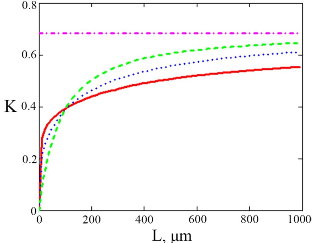 Рисунок 2. Зависимость общего коэффициента поглощения от длины лазерного импульса при частоте, соответствующей энергии 1 электрон-вольт, для пластин арсенида галлия разной толщины. Сплошная линия соответствует толщине пластины L = 10 мкм, пунктирная линия толщине L = 100 мкм, штриховая линия — L = 1 мм, штрихпунктирная линия — L = 3 мм. Источник: Journal of Optics