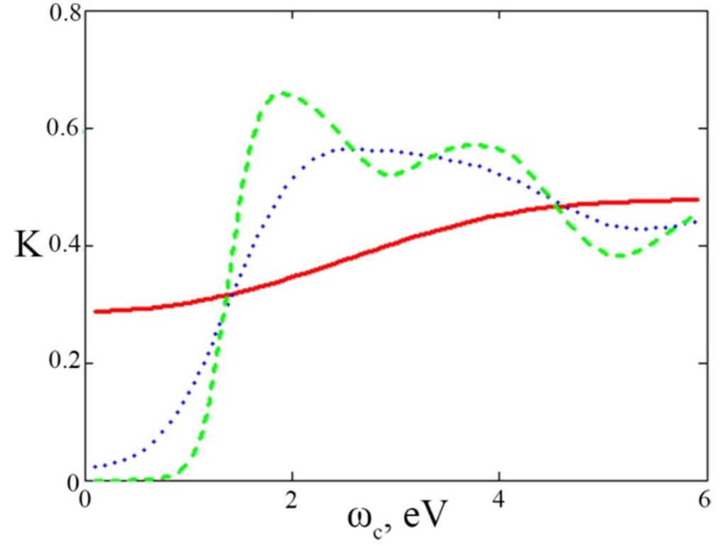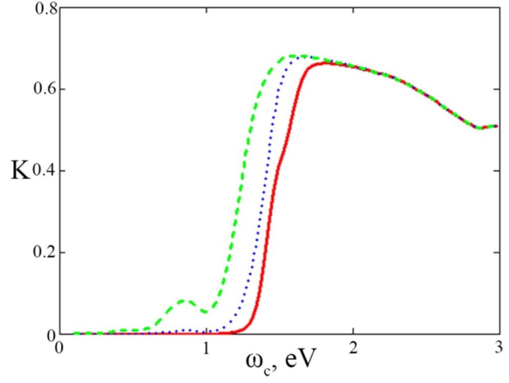 Рисунок 7. Зависимость общего коэффициента поглощения пластины арсенида галлия от частоты лазера, выраженной в электрон-вольтах, с длительностью импульса 7,2 фемтосекунды для различных значений толщины пластины. Сплошная линия соответствует толщине 10 микрометров, пунктирная линия — 100 микрометров, штриховая линия — 1 миллиметр. Источник: Journal of Optics.