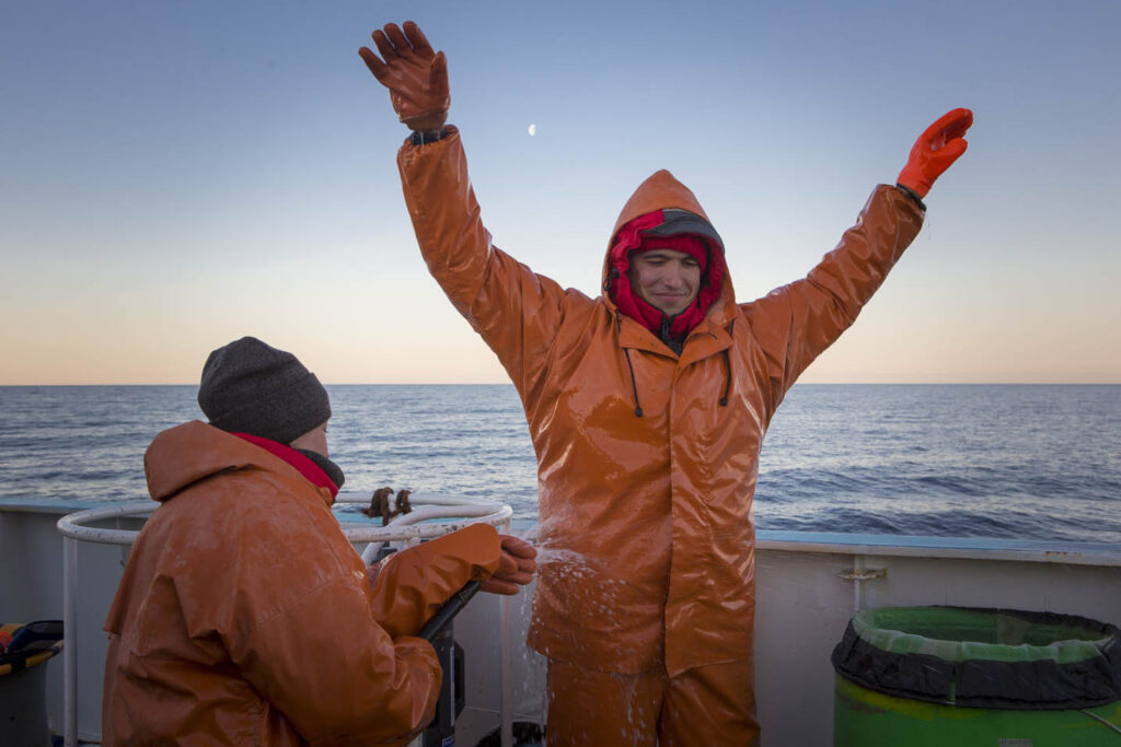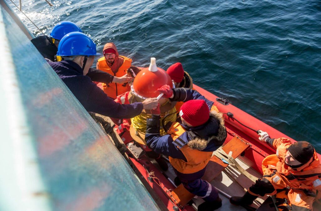 Для поиска волн команда использует комплекс методов: спутниковые снимки, радары, коптер. Иногда внутренние волны видно даже с верхней палубы. Они проявляются в виде сликов — белесых-гладких участков на поверхности воды. На отдельных станциях отряд спускается на моторной лодке, чтобы расставить автономные буи. Несколько часов они будут копить данные о температуре, солености и плотности воды. Эти же показатели параллельно измеряют с кормы с помощью «йо-йо» зондирования. Небольшой зонд на тросе с грузом опускают в море и поднимают, опускают и поднимают… И так 4, 6, а то и 12 часов подряд!