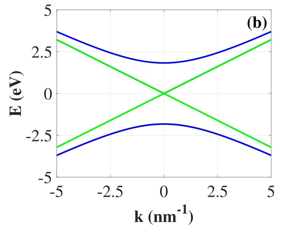 Рисунок 1. Закон дисперсии для электрона в углеродной нанотрубке. Зеленая линия соответствует квантовому числу j = 0, верхняя синяя линия j = 1, а нижняя синяя линия соответствует j = — 1. Источник: Physical Review B