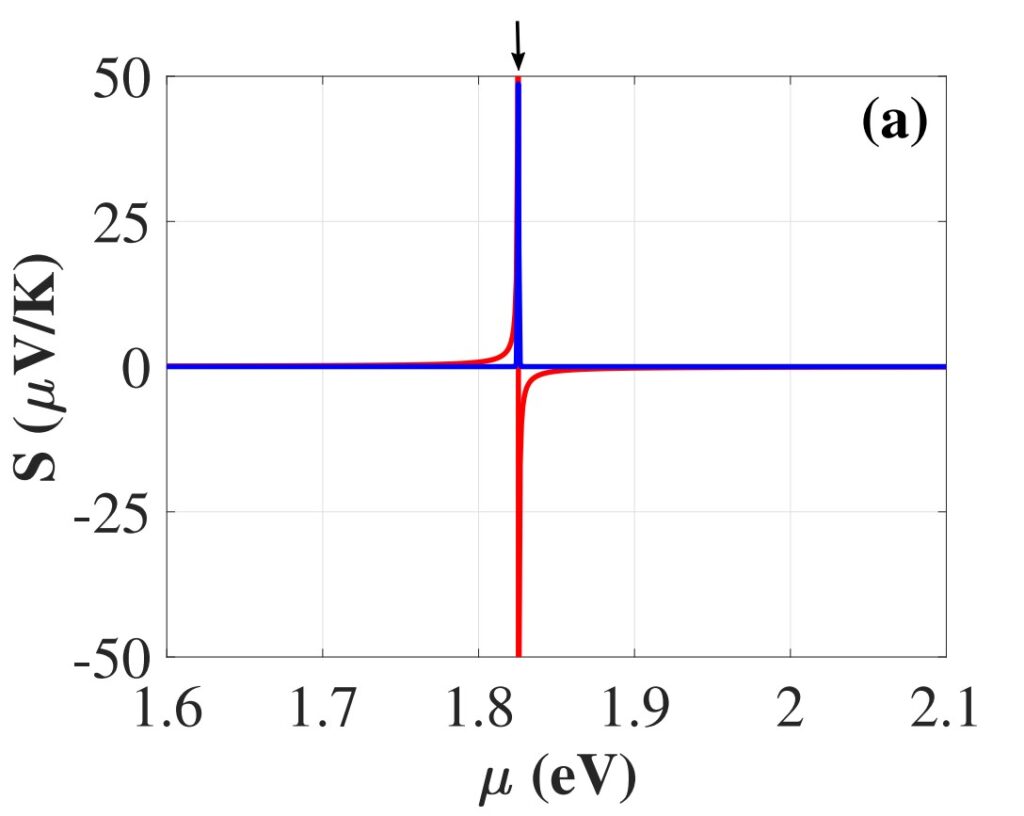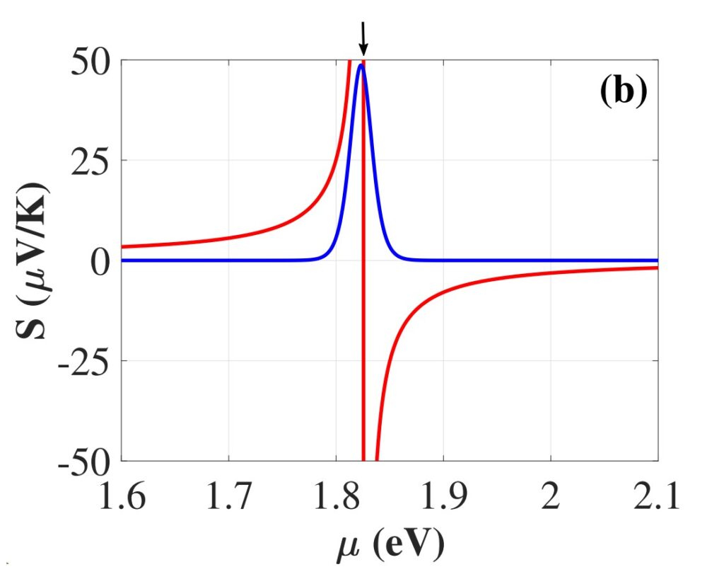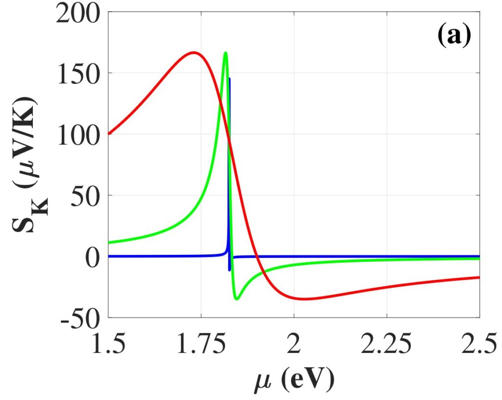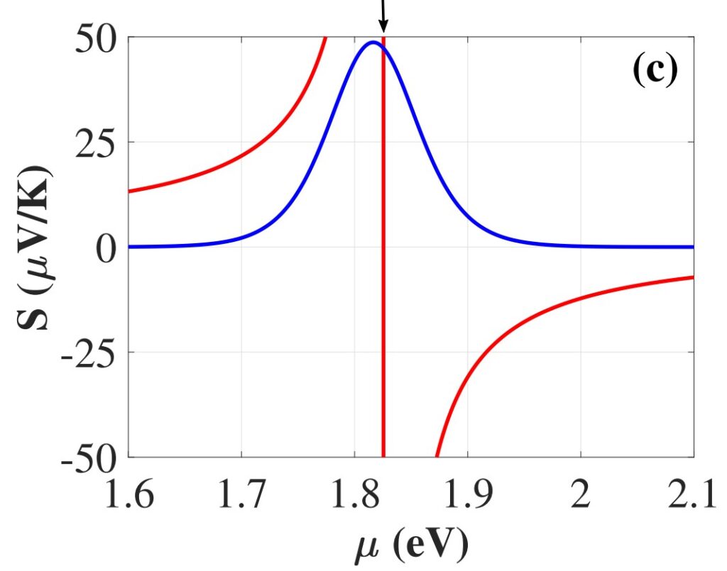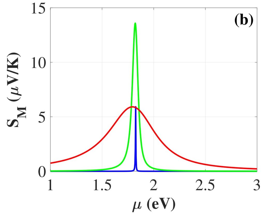 Кроме того, при любых температурах существует огромная принципиальная разница в результатах, полученных с помощью подхода Кельвина и подхода Мотта. Подход Кельвина предсказывает гиперболический спад коэффициента Зеебека вдали от резонанса между химическим потенциалом и дном энергетической подзоны. В точке резонанса наблюдаются сингулярность и смена знака коэффициента Зеебека. Напротив, формула Мотта предсказывает конечное значение коэффициента Зеебека на дне подзоны размерного квантования, отсутствие смены знака и быстрый экспоненциальный спад вдали от резонанса. Таким образом, даже при низких температурах эти две зависимости существенно отличаются как при приближении к точке резонанса, так и при большом удалении от нее: экспоненциальный спад намного быстрее гиперболического.