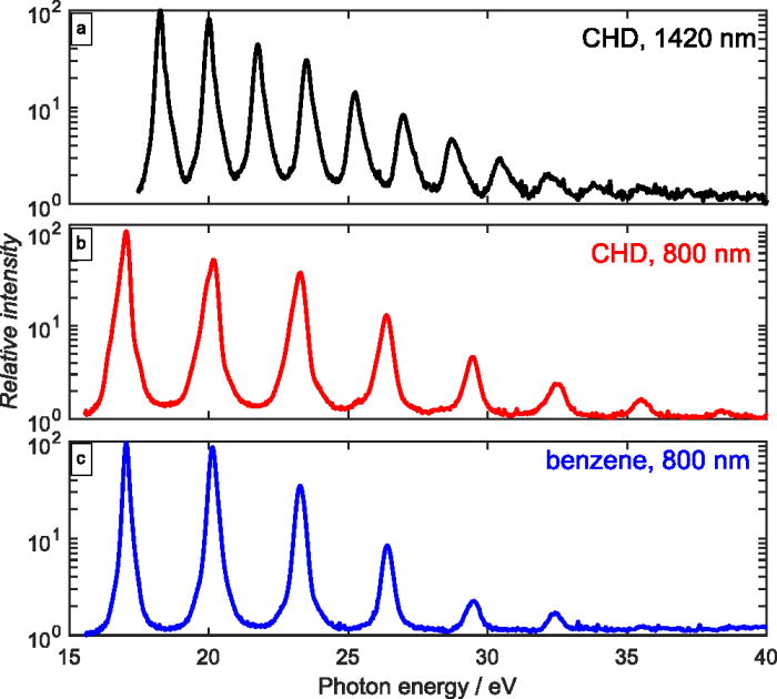 Рисунок 1. Спектры высоких гармоник (а) CHD, полученные с помощью импульсов длительностью 40 фемтосекунд и длиной волны 1420 нм при пиковой интенсивности импульсов 6 ×10^13 Вт/см 2 , (b) CHD и (c) бензол, полученный с помощью импульсов длительностью 27 фемтосекунд и длиной волны 800 нм при пиковой интенсивности 1,0 ×10^14 Вт/см 2. Источник: Structural Dynamics